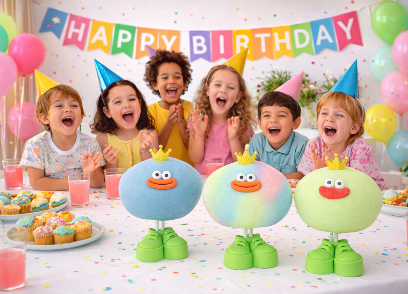 Kleine flauschige freunde die teil eines jeden cottonkingerlebniss sind. mit ihrem puzigen, verspielten aussehen laden sie alles und jeden in ein magische zuckerwattenwelt ein.